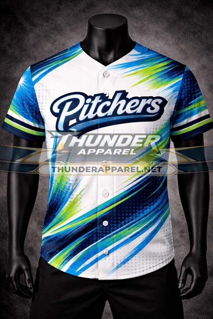 Stand out on the field with our premium custom sublimation baseball and softball jersey, featuring a bold and modern “Pitchers” design with dynamic blue, green, and white streak patterns. Designed for teams that want performance and style, this button-up jersey delivers a professional look with unmatched comfort.